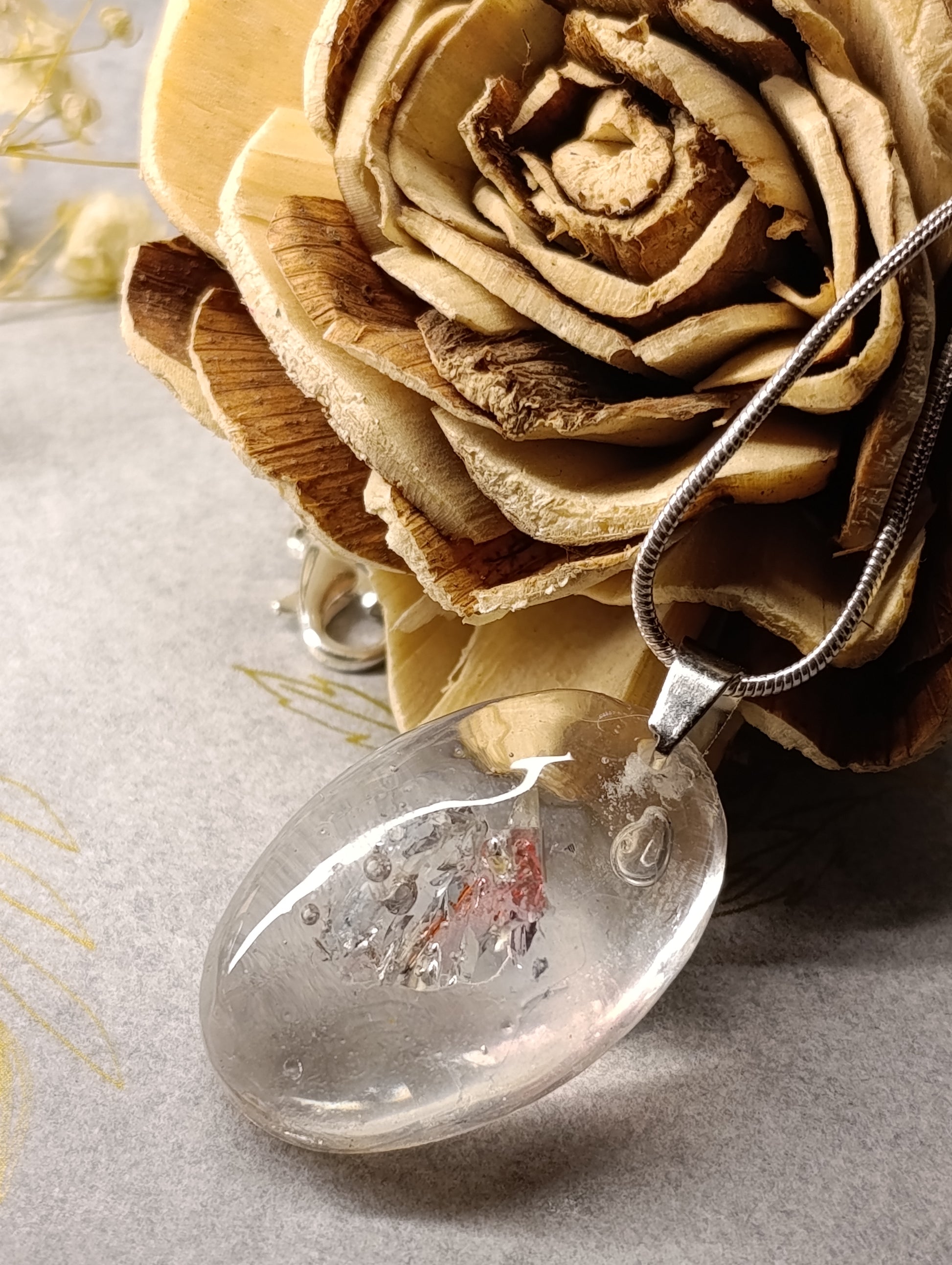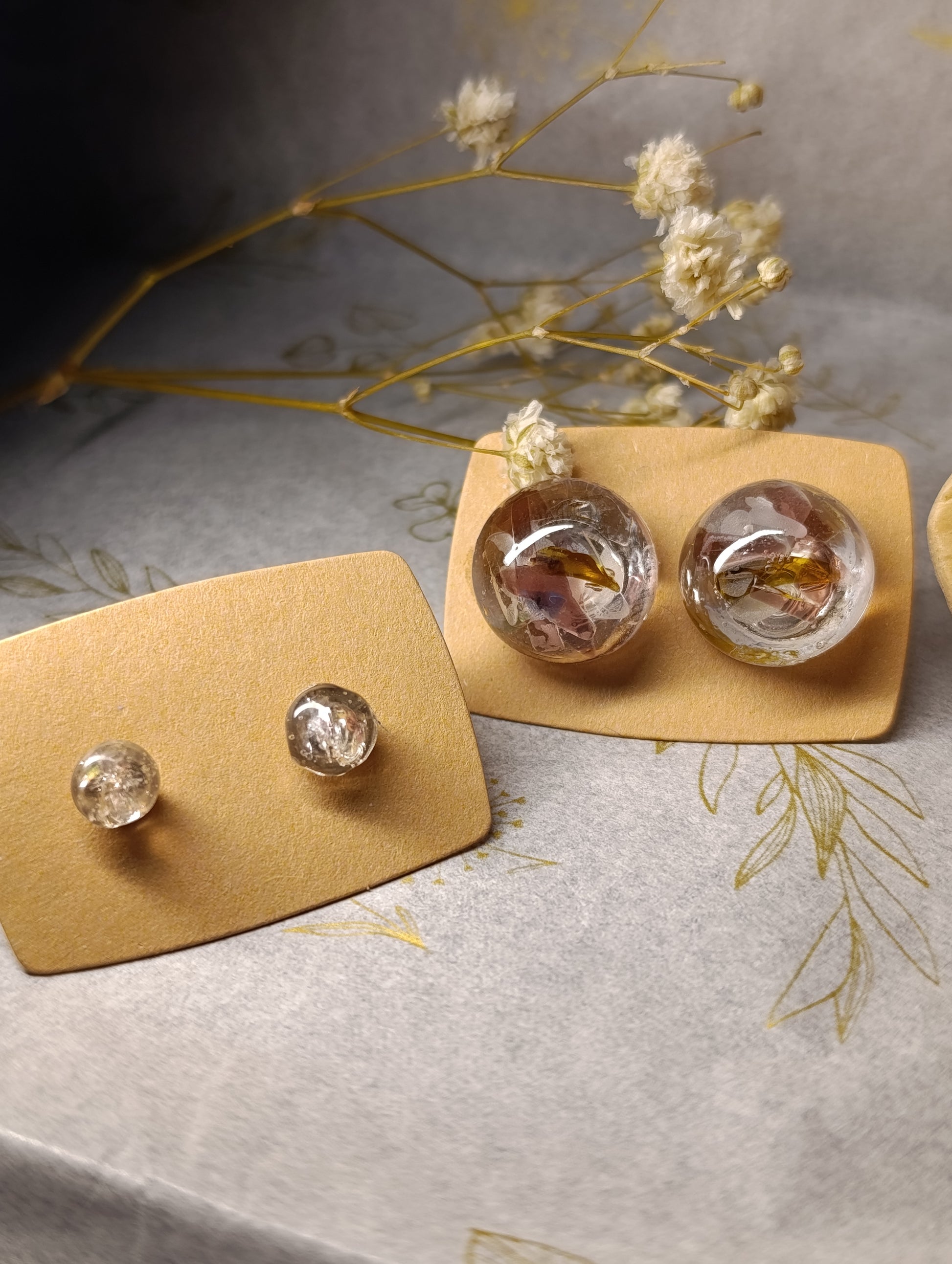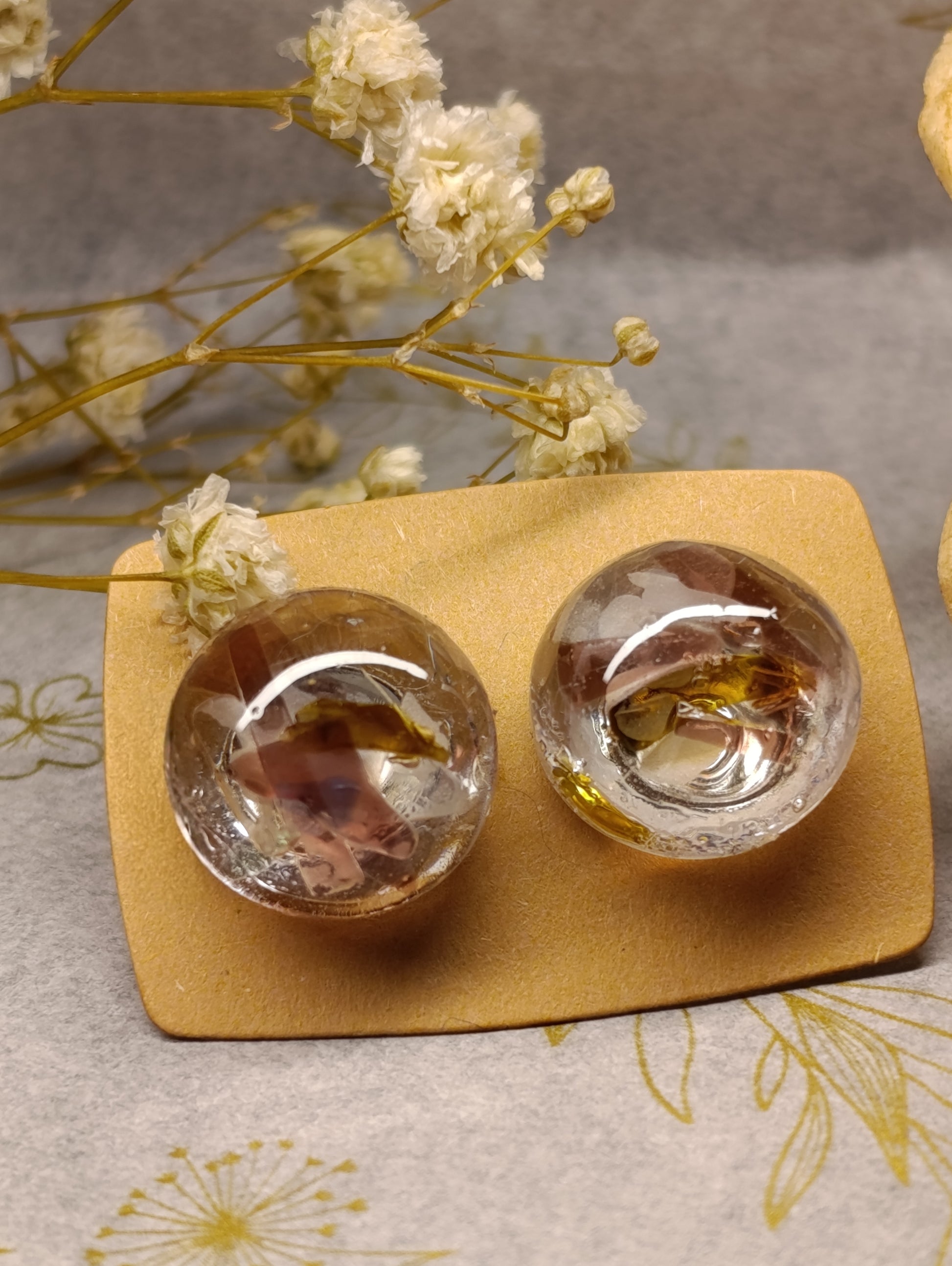Cada joya preserva diminutos fragmentos de vidrio reciclado en una semi-esfera de resina pura y cristalina. La resina transparente actúa como una lupa, invitándote a descubrir la belleza oculta en los detalles más pequeños, como si observaras a través de una gota de lluvia en una ventana.
