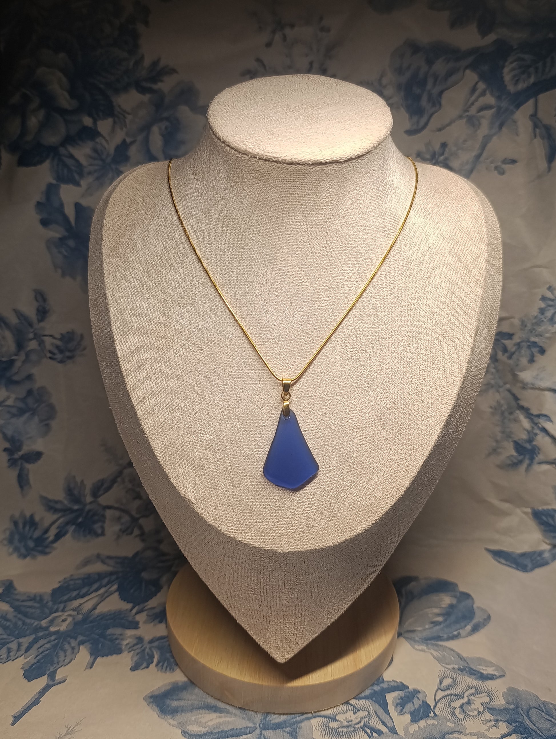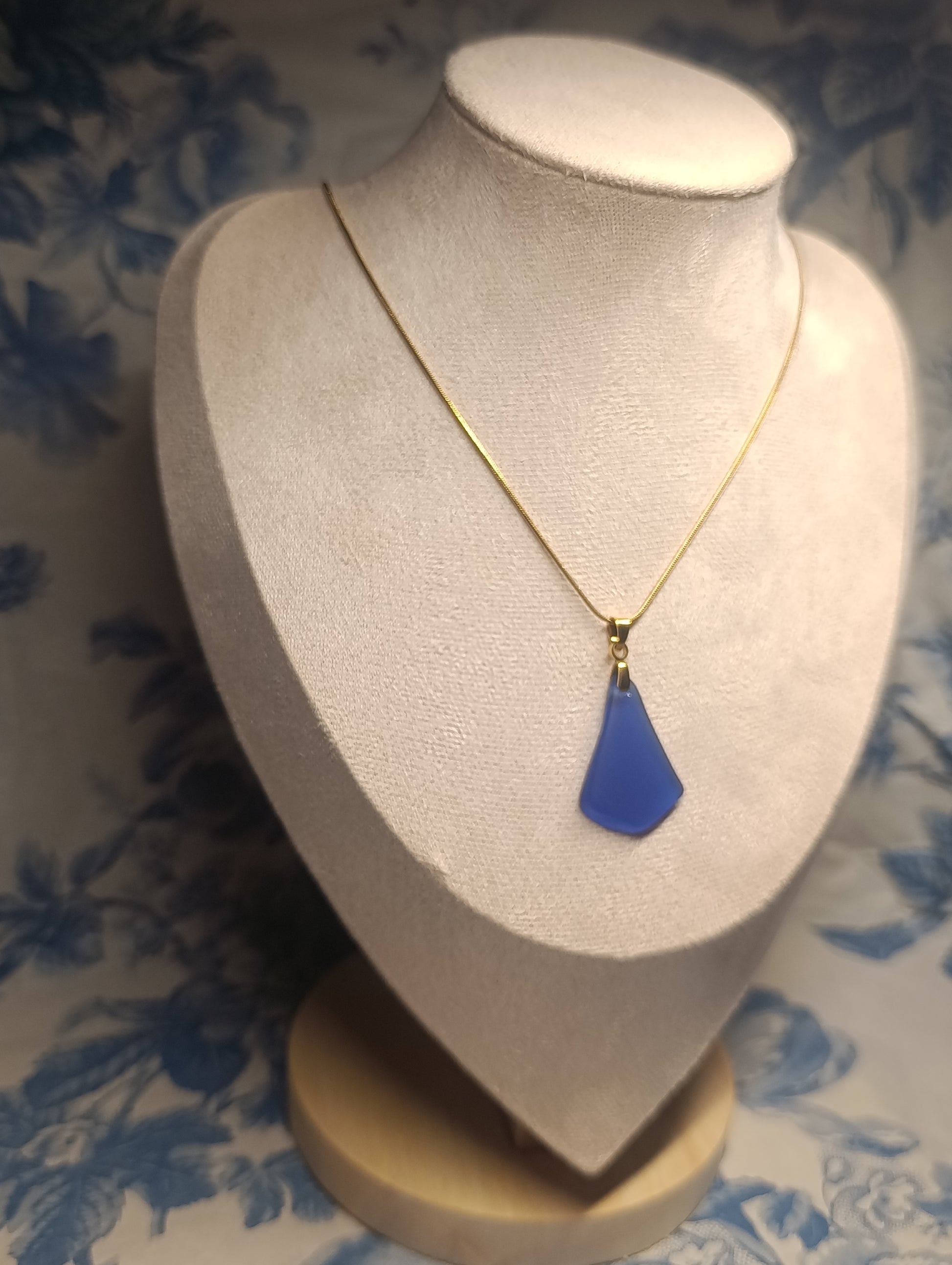 Colgante de vidrio azul cobalto en forma de lágrima con cadena dorada.
