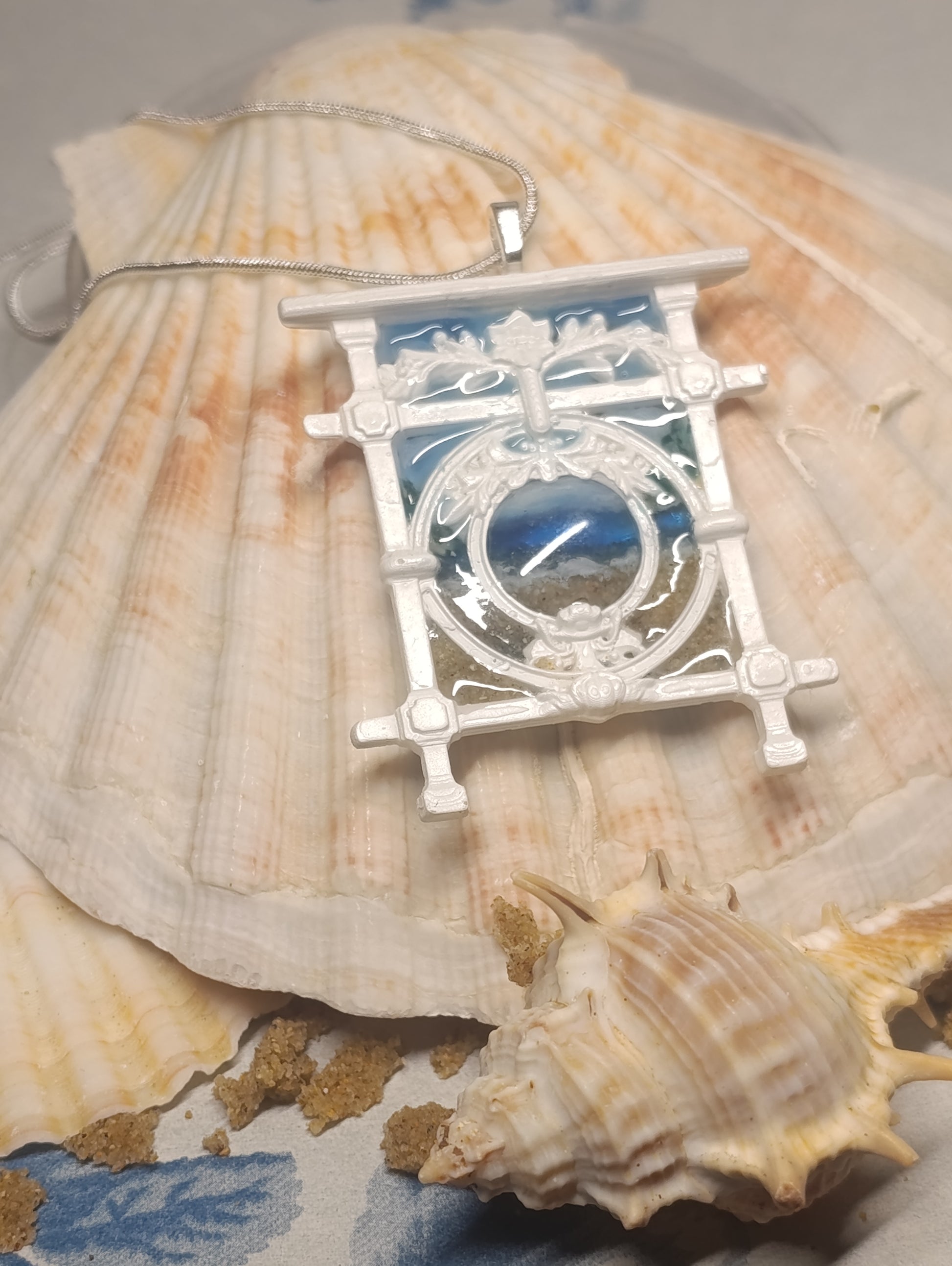 Escena Marina: Resina azul y arena que recrean la orilla del mar.