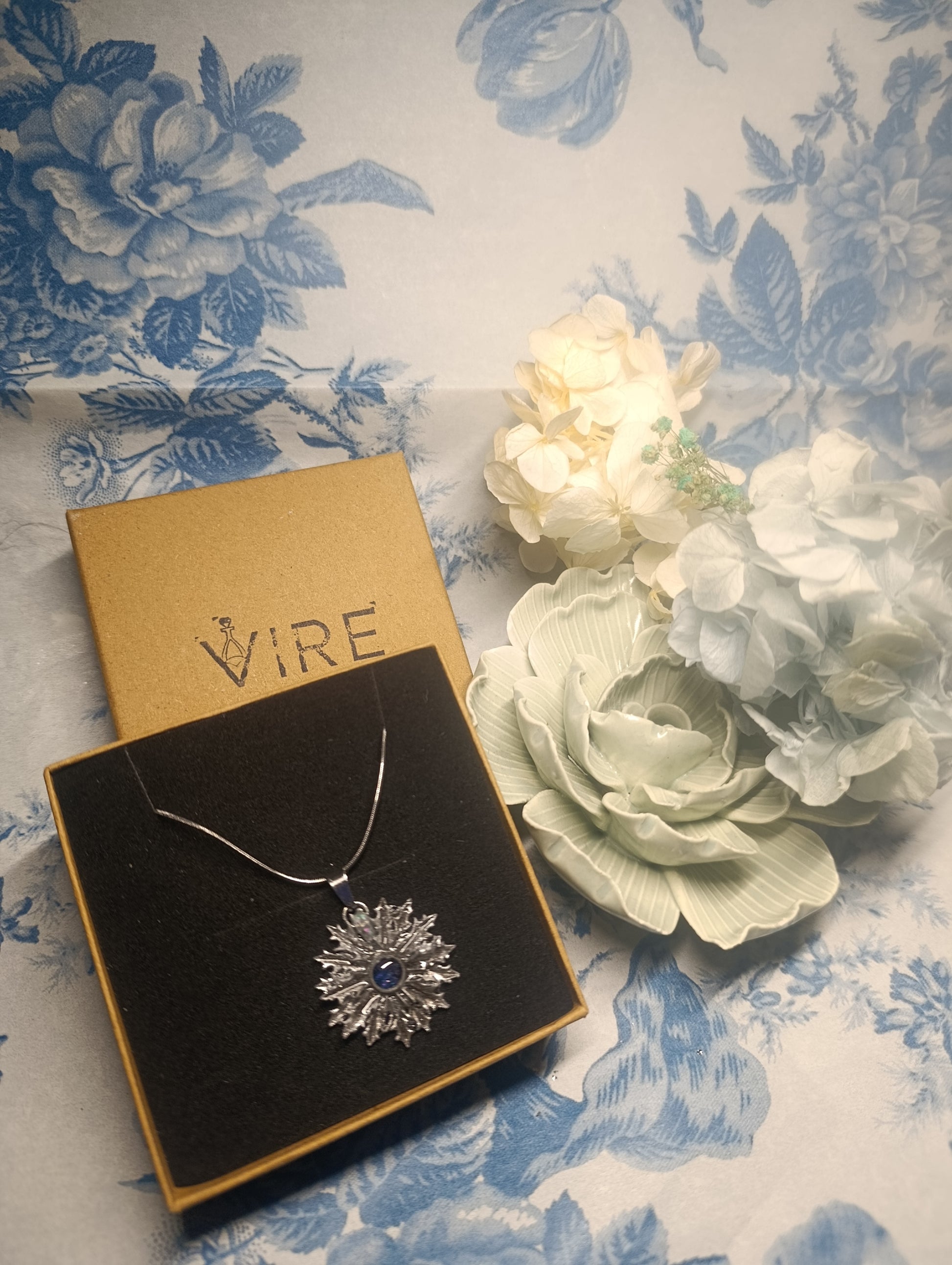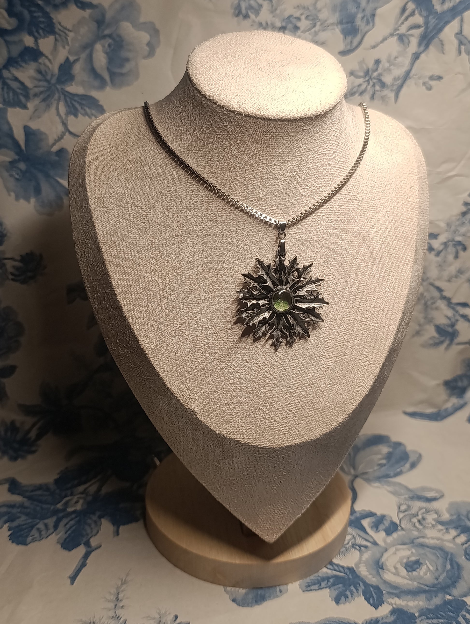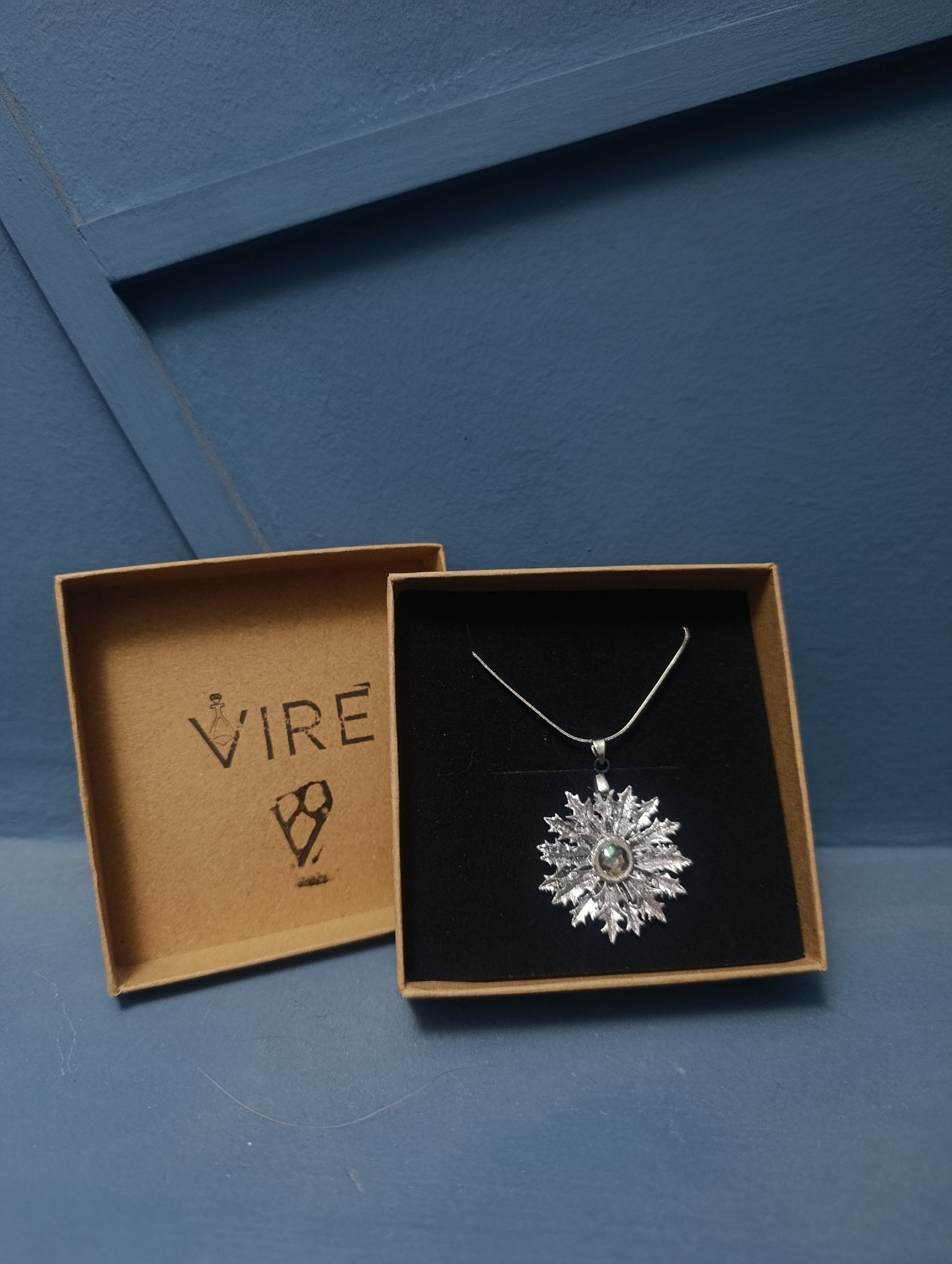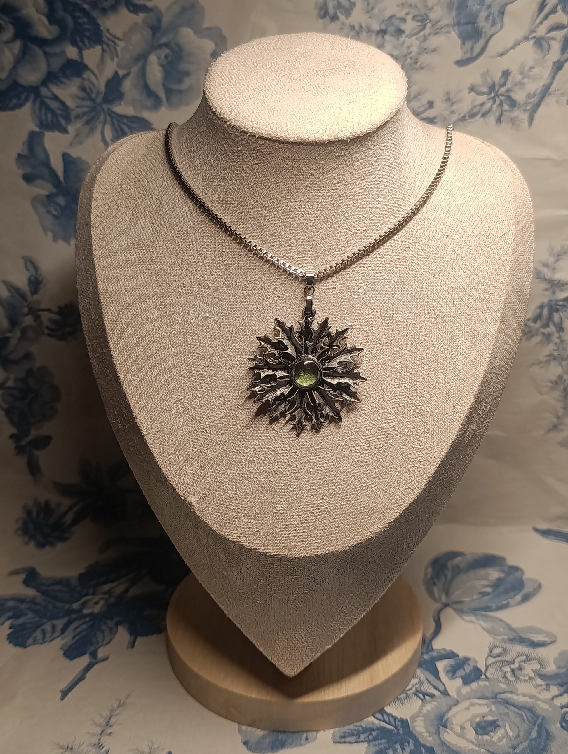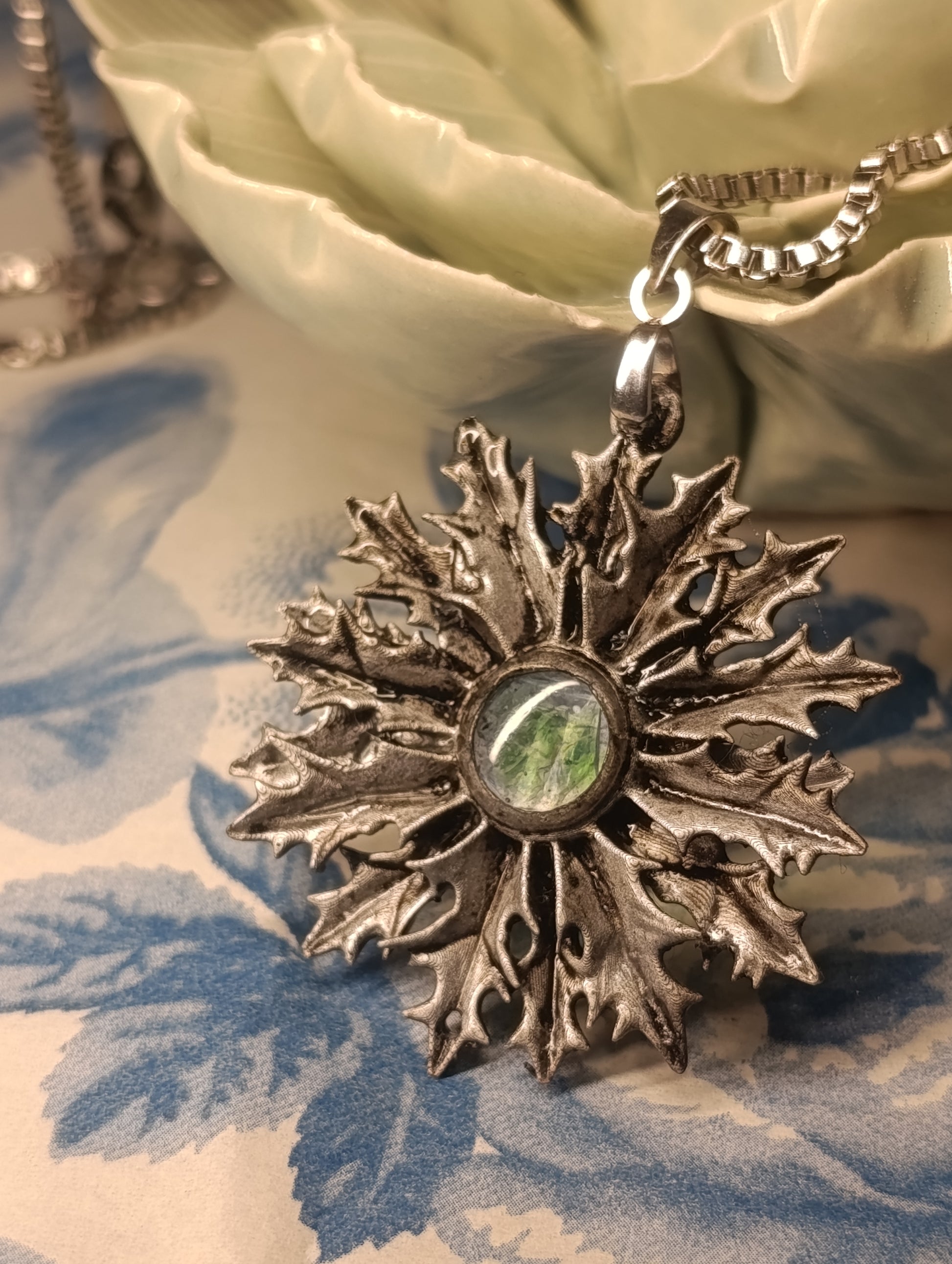 Por eso he recreado este símbolo tradicional en resina plateada con un acabado envejecido que resalta sus detalles. En su centro, el corazón de la flor está hecho con vidrio reciclado de color verde, aportando un toque de luz y sostenibilidad a la tradición.