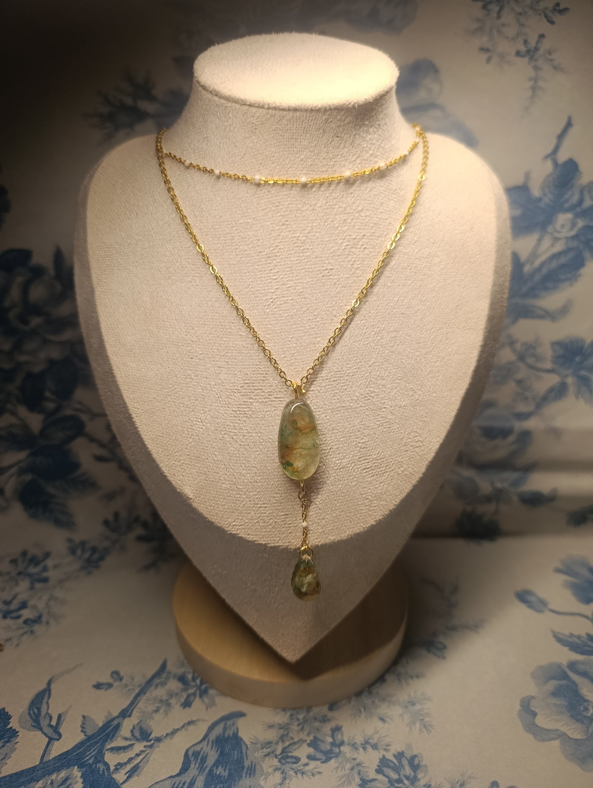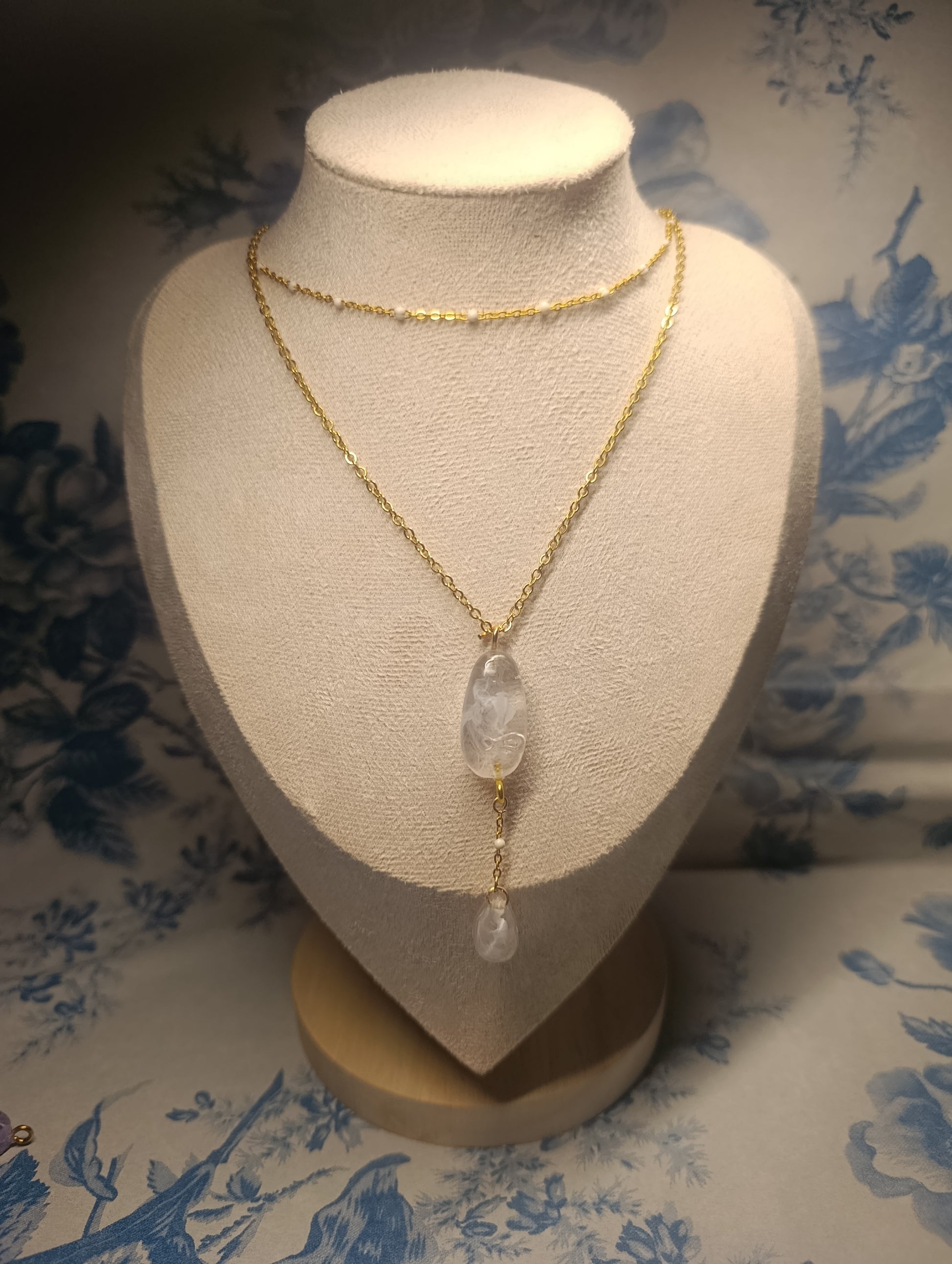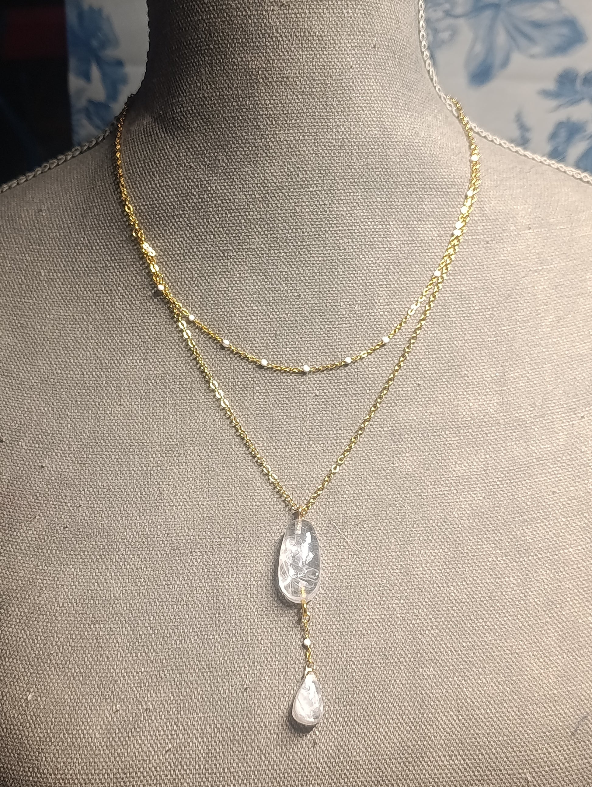 Materiales: doble cadena dorada de acero inoxidable y vidrio iridiscente encapsulado en resina.