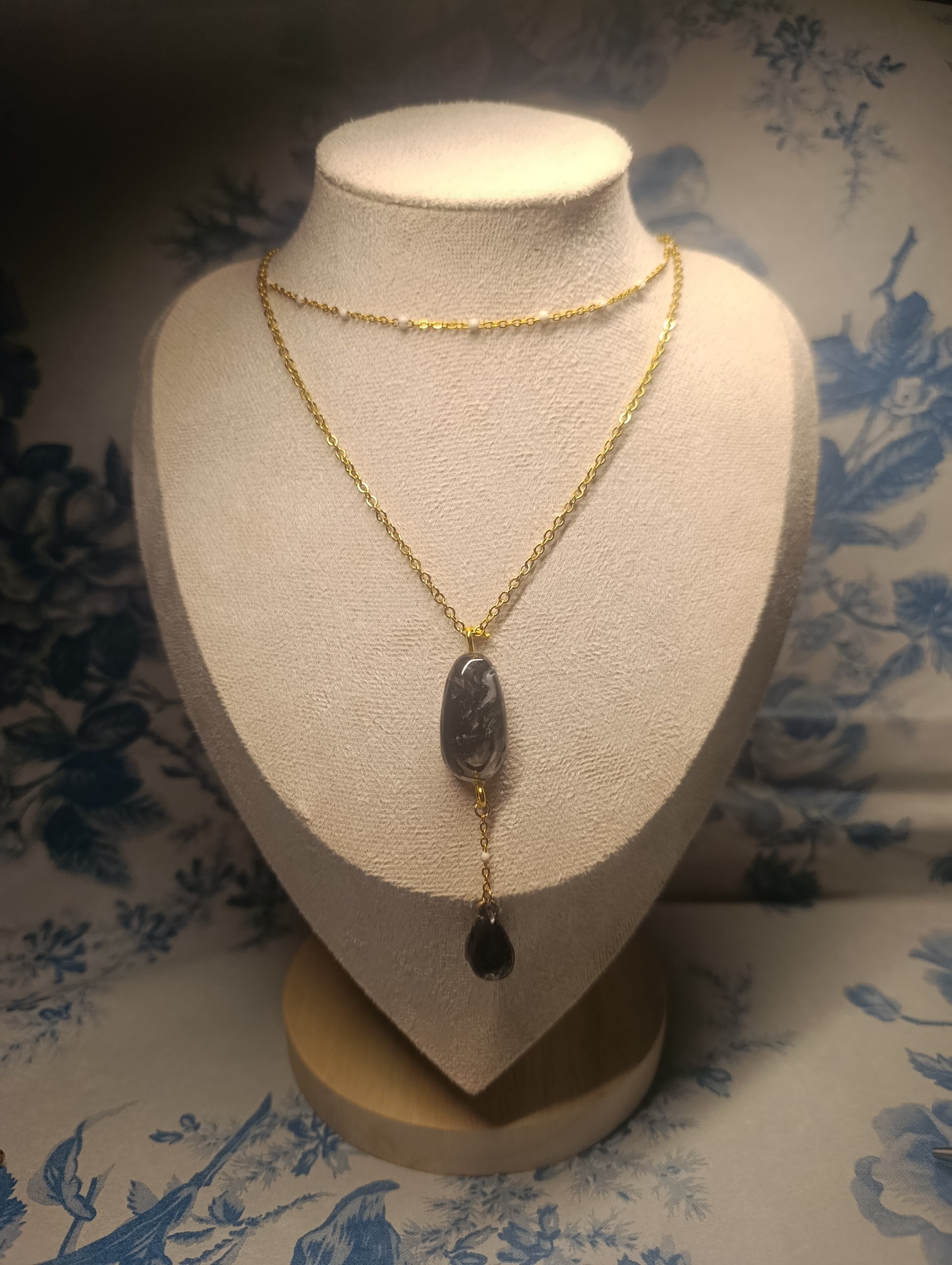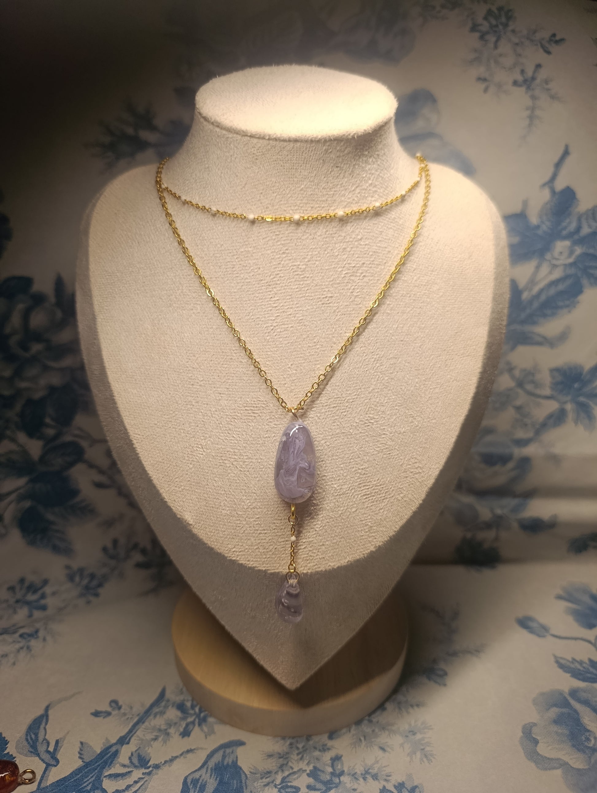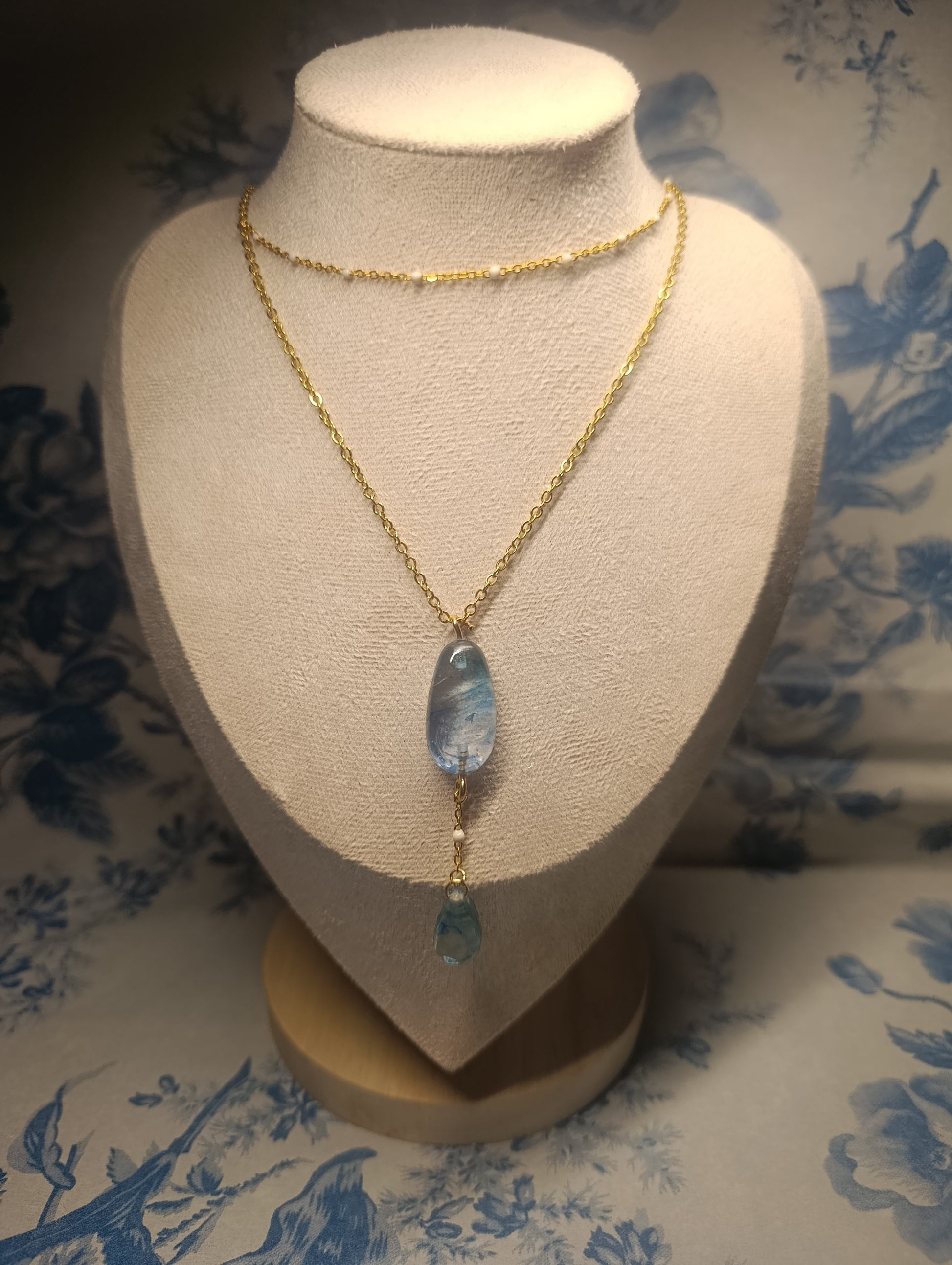 Materiales: doble cadena dorada de acero inoxidable y vidrio iridiscente encapsulado en resina.