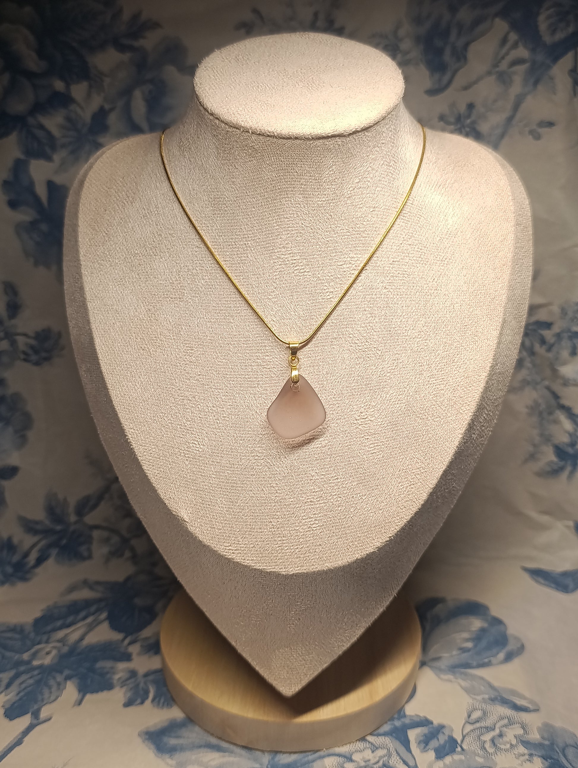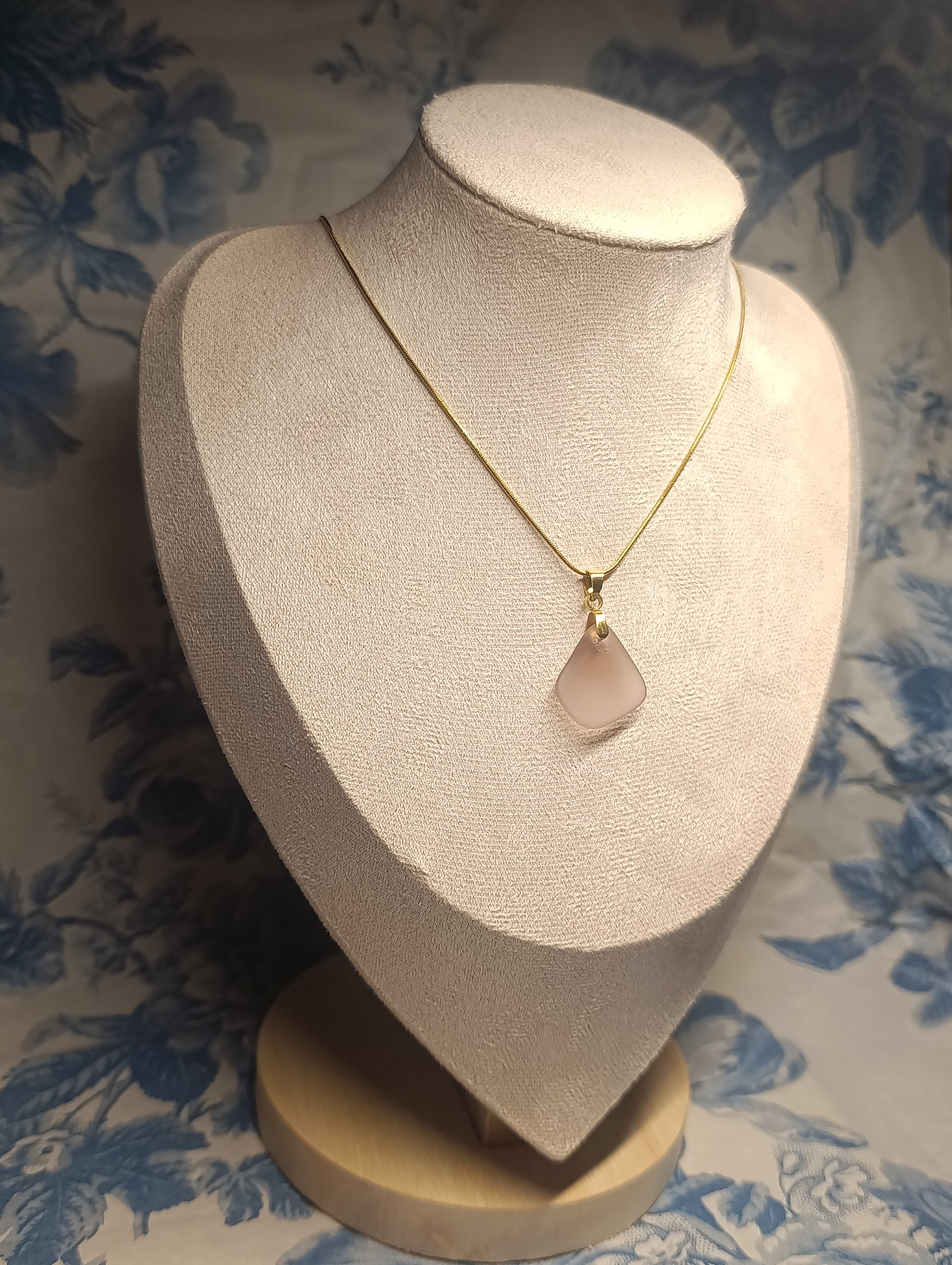 Vidrio rosa pulido en cadena dorada de acero inoxidable.