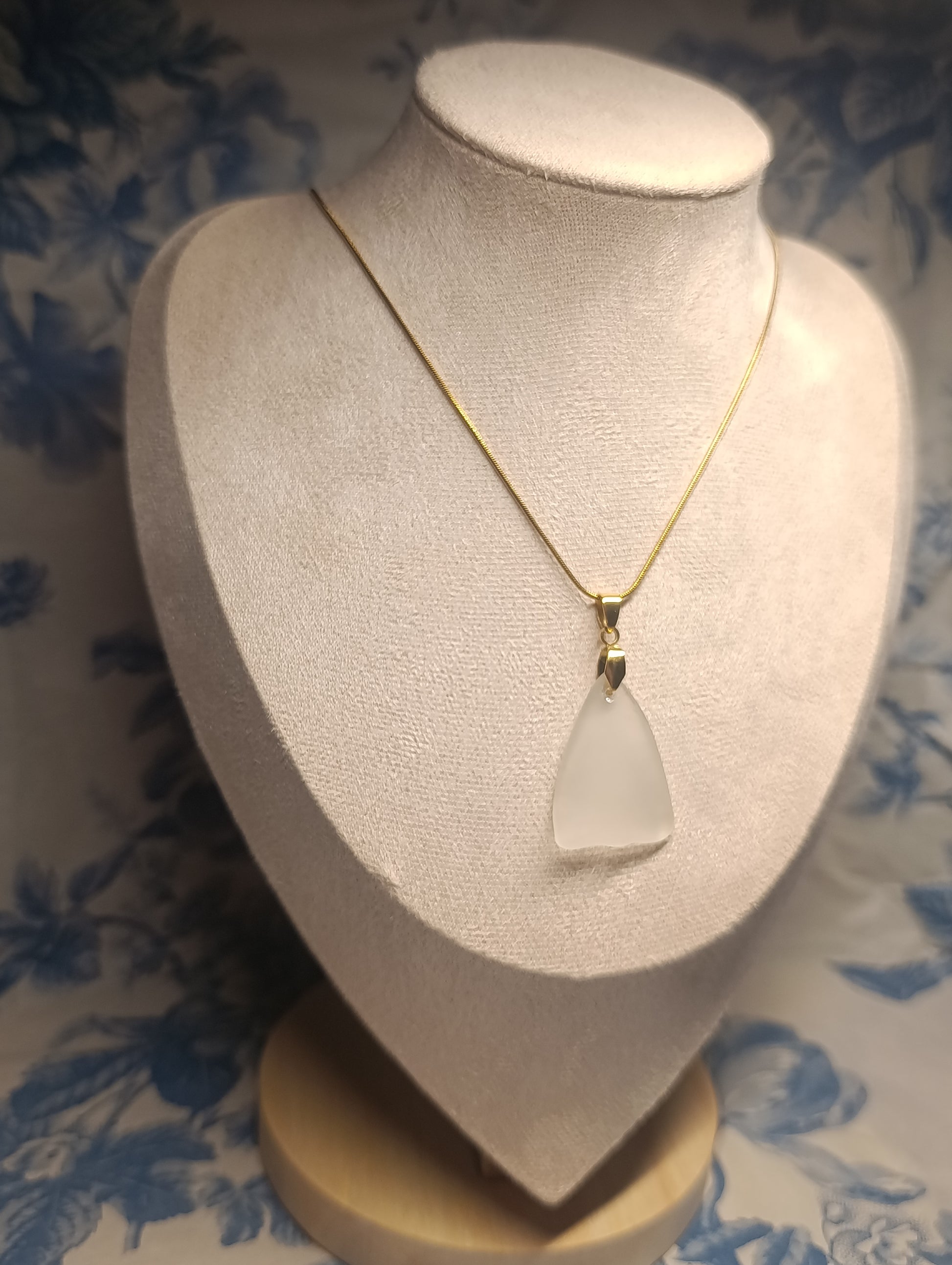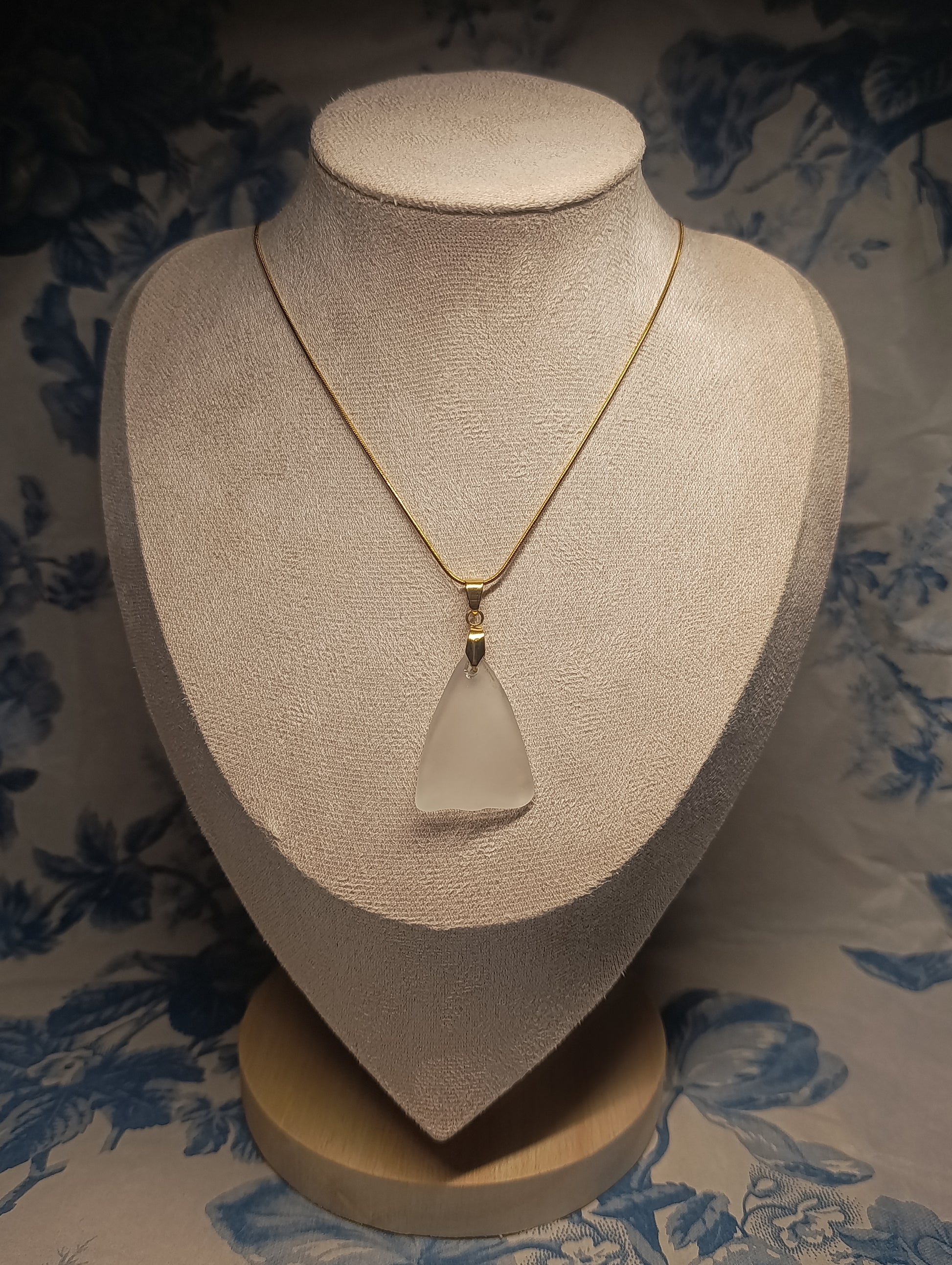 Colgante de vidrio translúcido pulido con cadena dorada de acero inoxidable.