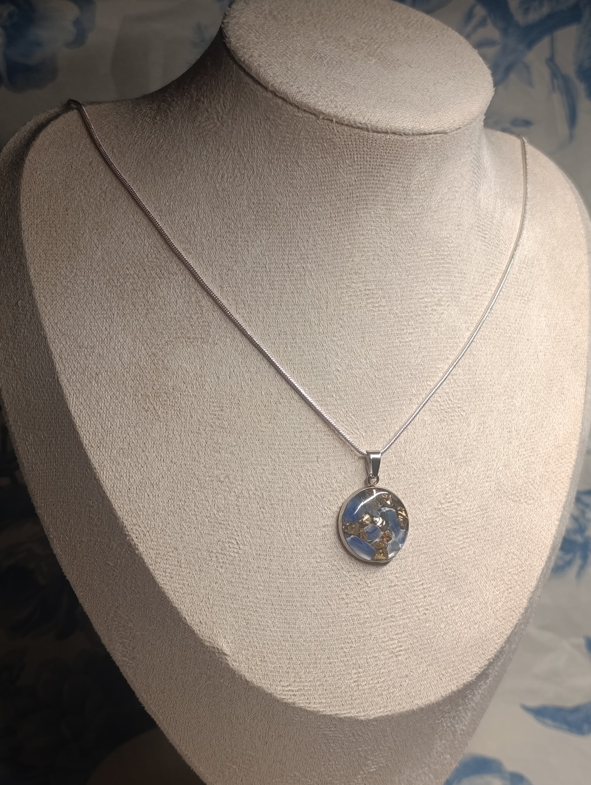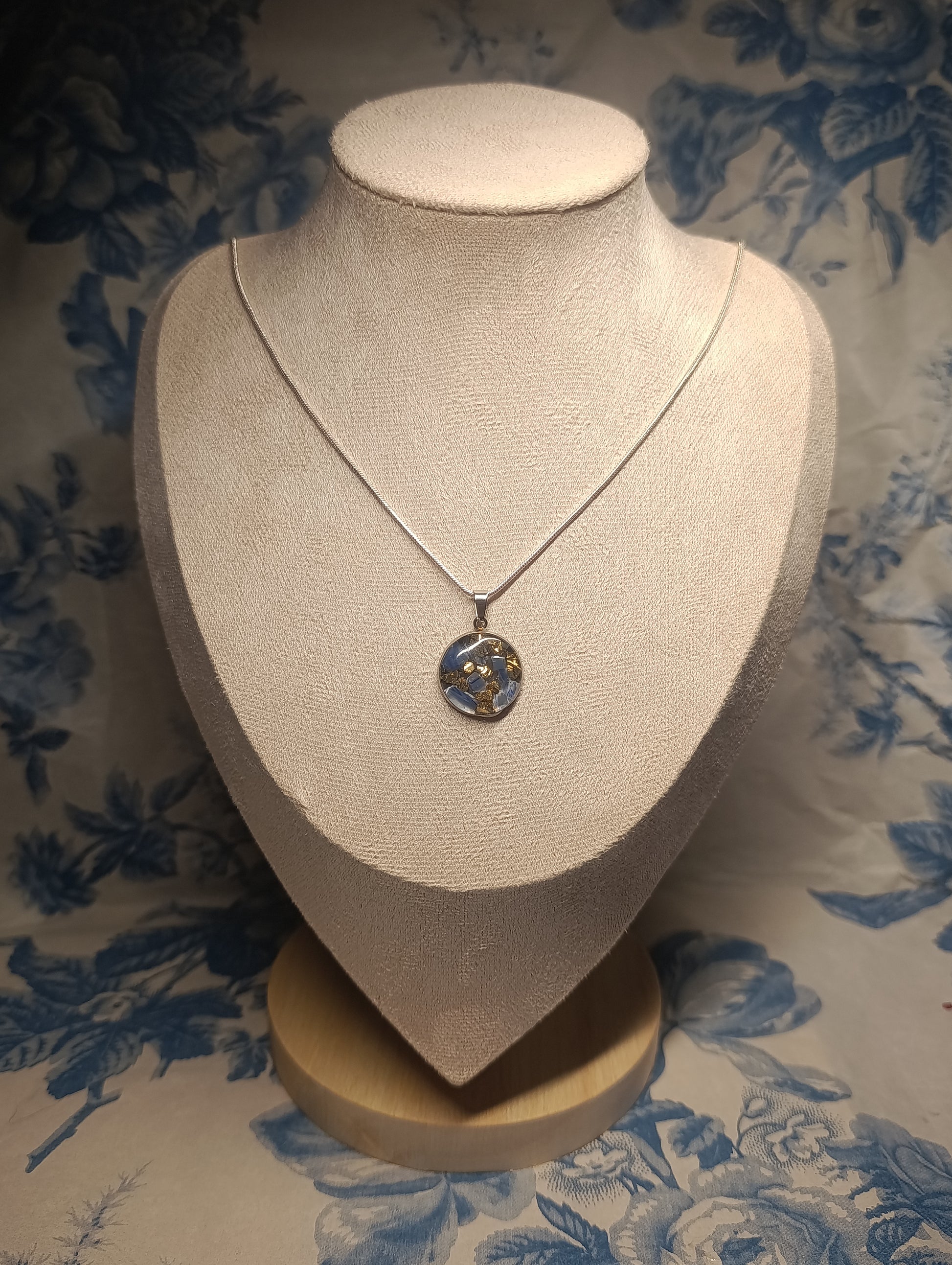 Cada colgante es exactamente eso: una composición única creada a mano, fragmento a fragmento. En su interior, teselas de vidrio reciclado de diferentes colores se encuentran con destellos de pan de oro, creando un micromosaico irrepetible.